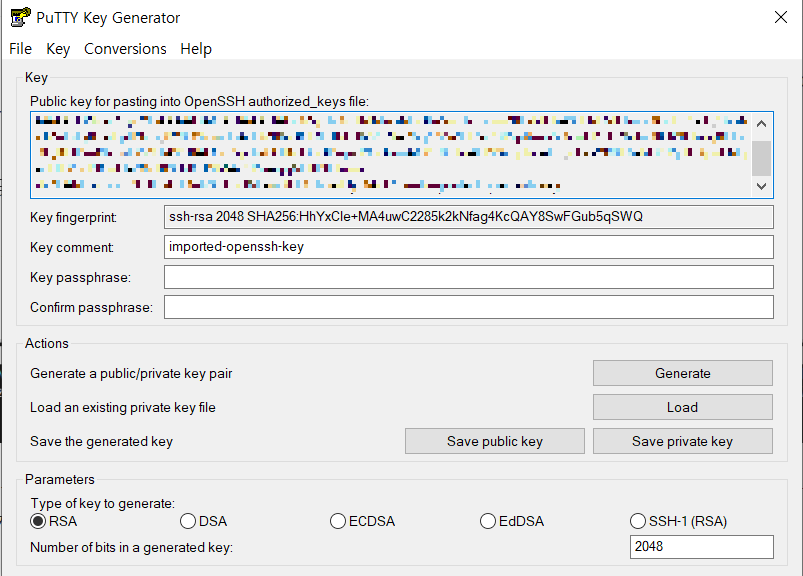 푸티젠에서 비밀키를 불러와서 공개키(모자이크 한 부분)를 확인한 후 복사한다.
