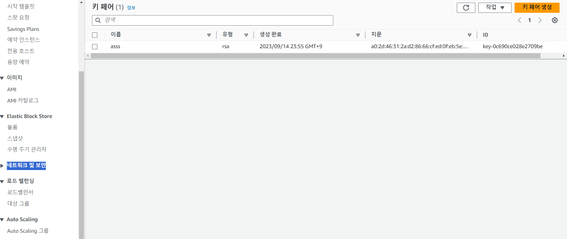 ec2 > 네트워크 및 보안 > 키페어 메뉴에서 새로 키를 생성한다.